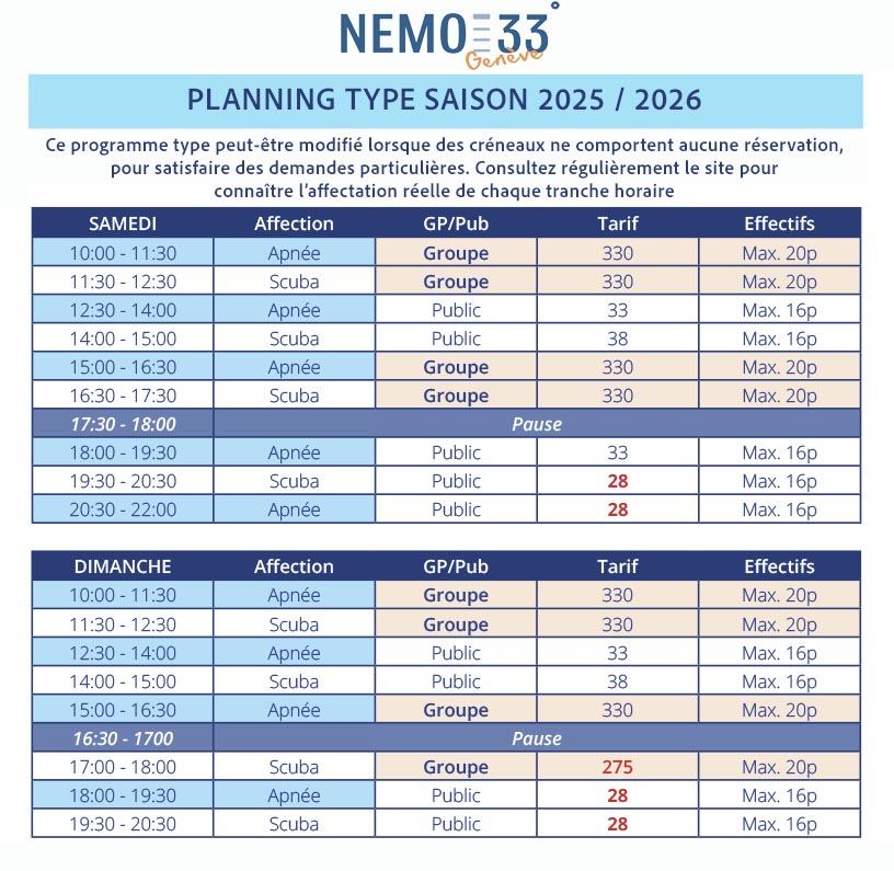 Nous sommes à votre disposition pour des demandes particulières ou en cas de difficultés : geneve@nemo33.com.